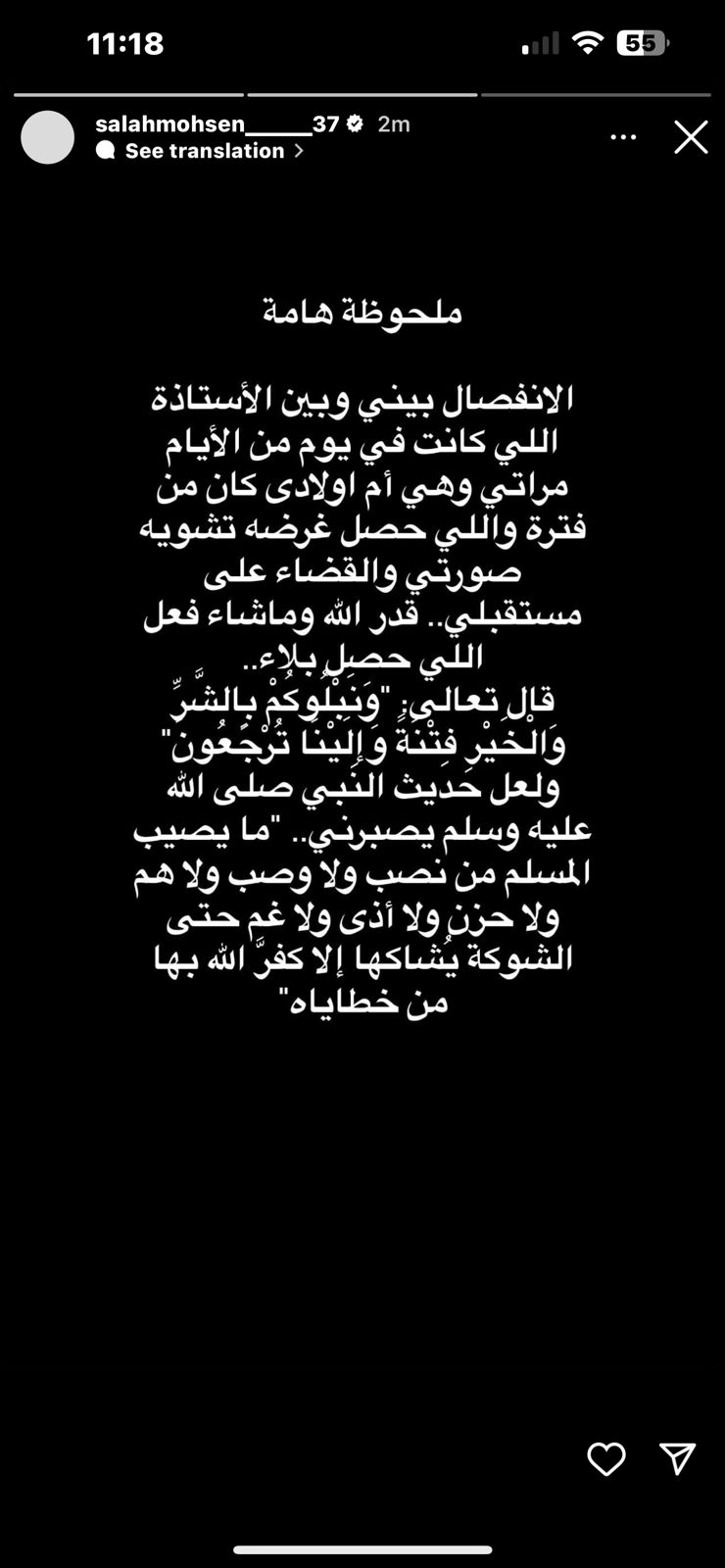ونشر صلاح محسن بيانًا رسميًا، عبر حسابه الرسمي على موقع التواصل الاجتماعي انستجرام، أكد فيه اعتذاره على ما بدر من زوجته حول نشرها شات وصور وتسريبات من صفحته الشخصية، مشيرًا إلى أن الخلافات الزوجية مكانها ليس السوشيال ميديا.