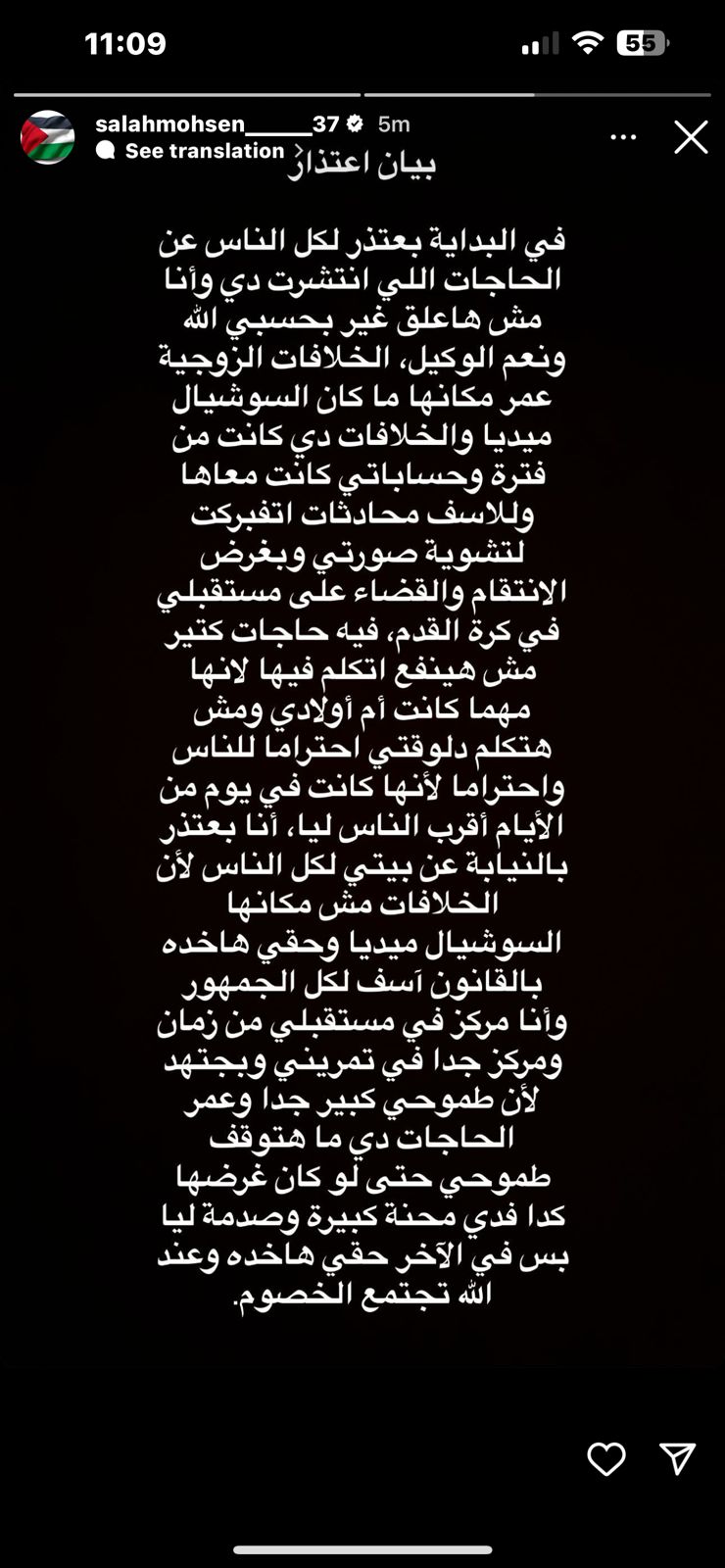 وقال صلاح محسن: في البداية بعتذر لكل الناس عن الحاجات اللى انتشرت دي، وأنا مش هاعلق غير بحسبي الله ونعم الوكيل.. الخلافات الزوجية عمر مكانها ما كان السوشيال ميديا والخلافات دي كانت من فترة وحساباتي كانت معاها، وللأسف محادثات اتفبركت لتشويه صورتي وبغرض الانتقام والقضاء على مستقبلي في كرة القدم.