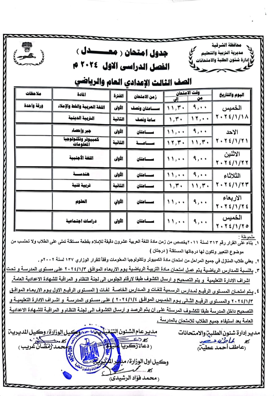جدول امتحانات الصف الثالث الإعدادي 2024 محافظة الشرقية