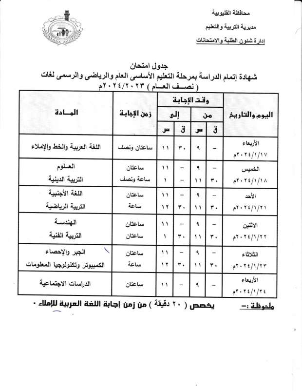 جدول امتحانات الصف الثالث الإعدادي 2024 محافظة القليوبية