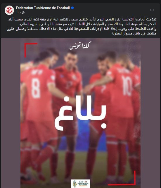 ونشر الاتحاد التونسي لكرة القدم عبر حسابه الرسمي على فيسبوك بيانًا رسميًا يقول فيه: تقدّمت الجامعة التونسية لكرة القدم، اليوم الأحد، بتظلم رسمي للكونفدرالية الإفريقية لكرة القدم، بسبب أداء الحكم وحكام غرفة الفار، وكذلك مخرج المباراة، خلال اللقاء الذي جمع منتخبنا الوطني بنظيره المالي.