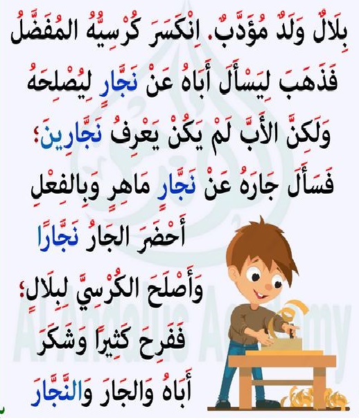 - بلال ولد مؤدب انكسر كرسيه المفضل فذهب ليسأل أباه عن نجار ليصلحه ولكن الأب لم يكن يعرف نجارين فسأل جاره عن نجار ماهر وبالفعل أحضر الجار نجارا وأصلح الكرسي لبلال ففرح كثيرا وشكر أباه والجار والنجار
