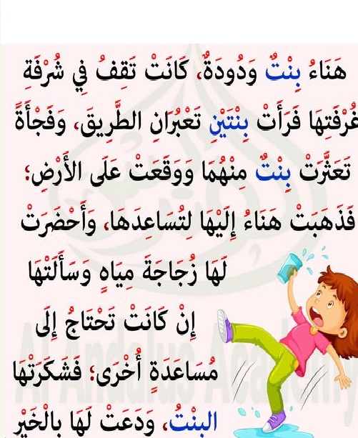 - هناء بنت ودودة كانت تقف في شرفة غرفتها فرأت بنتين تعبران الطريق وفجأة تعثرت بنت منهما ووقعت على الأرض فذهبت هناء إليها لتساعدها وأحضرت لها زجاجة مياه وسألتها إن كانت تحتاج إلي مساعدة أخرى فشكرتها البنت ودعت لها بالخيري