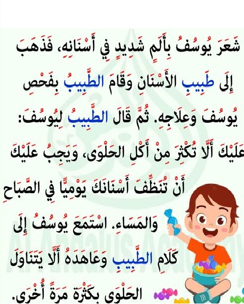 - شعر يوسف بألم شديد في أسنانه فذهب إلي طبيب الأسنان وقام الطبيب بفحص يوسف وعلاجه ثم قال الطبيب ليوسف عليك ألا تكثر من أكل الحلوى ويجب عليك أن تنظف أسنانك يوميا في الصباح والمساء استمع يوسف إلي كلام الطبيب وعاهده ألا يتناول الحلوي بكثرة مرة أخري