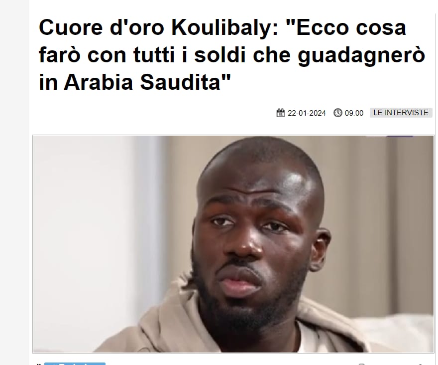 ووصف موقع calcionapoli24 الإيطالي مدافع الهلال خاليدو كوليبالي، بأنه يمتلك قلبًا من ذهب، بسبب ما سيفعله بأمواله وبناء مستشفى للأطفال بمسقط رأسه في السنغال.