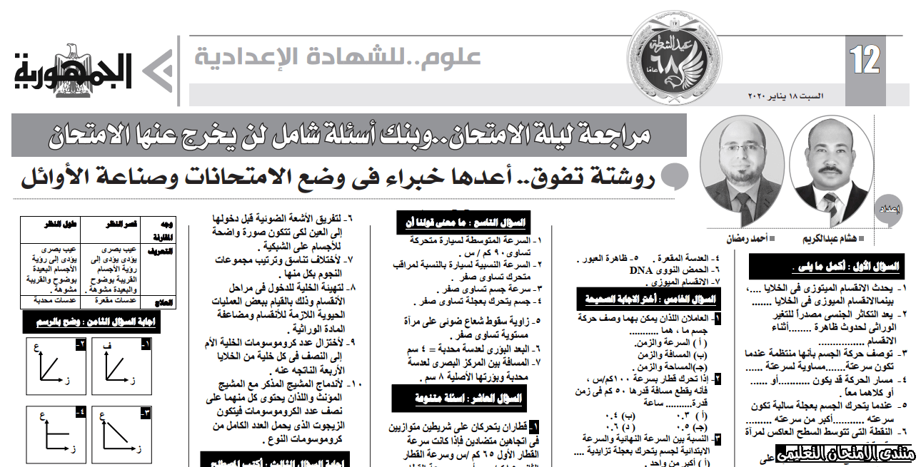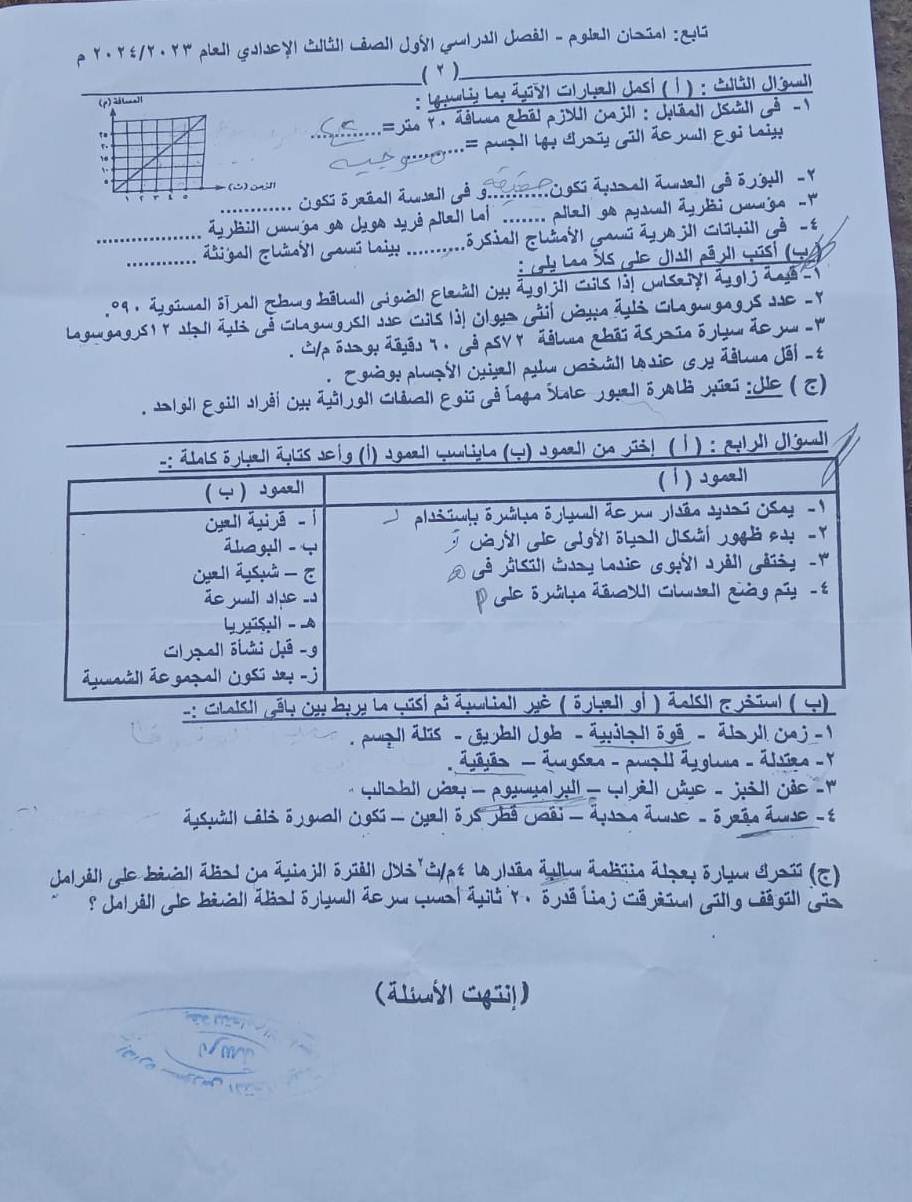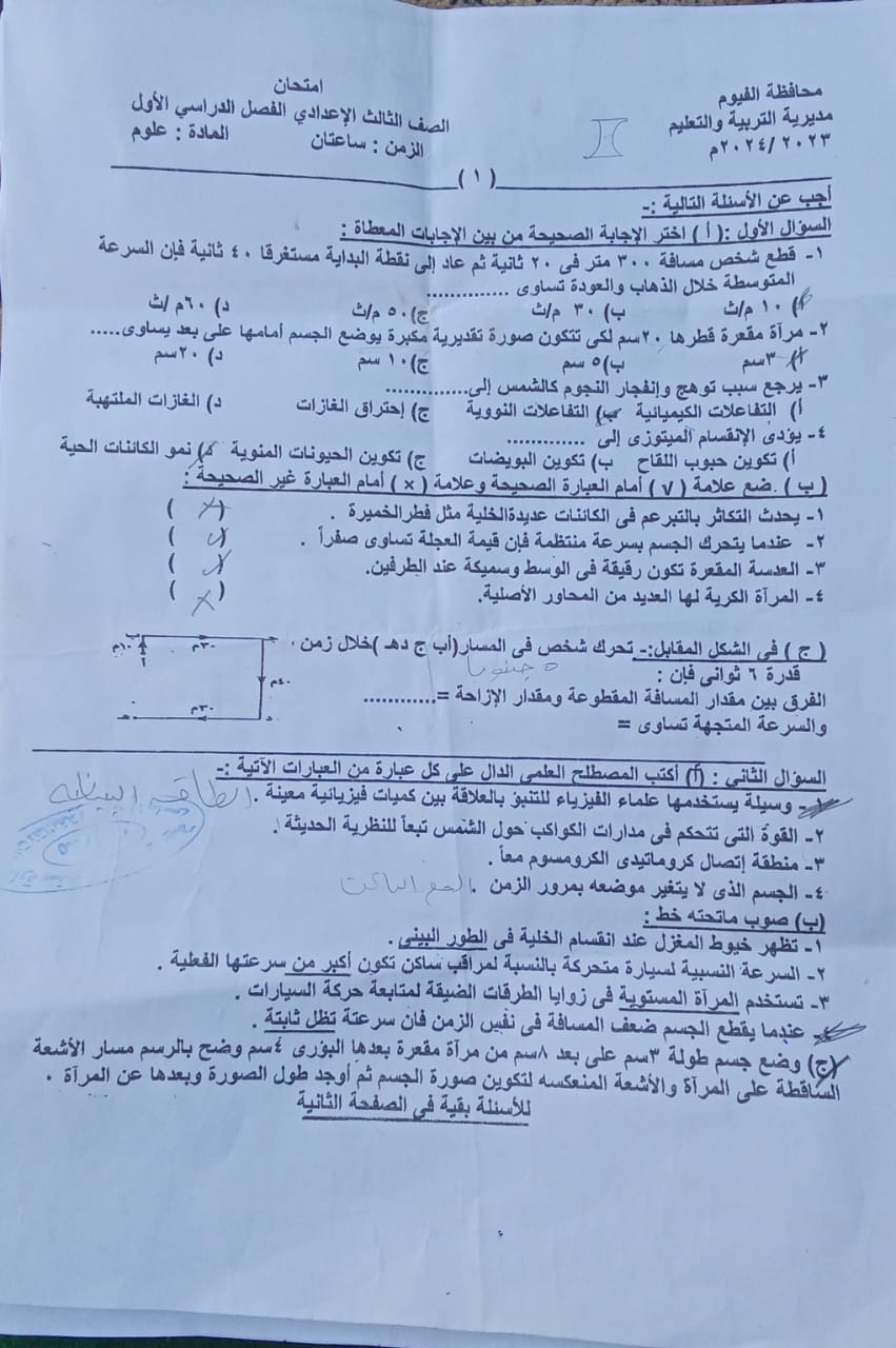 من أبرز النقاط التي ركزت عليها امتحانات علوم للصف الثالث الاعدادي الترم الأول pdf، هي المصطلحات العلمية التي يجب على الطلاب استذكارها، ومنها مصطلحات "السرعة النسبية- المحور الثانوي - الجسم المركزي - الحركة" وغيرها من المصطلحات التي يشمل عليه منهج العام الدراسي 2023\2024، ومن بين نماذج امتحانات الصف الثالث الإعدادي ترم أول 2024، نقدم النماذج التالية المجاب عنها: