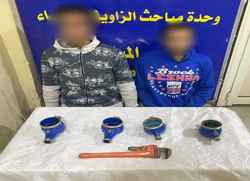 كما تمكنت الأجهزة من ضبط عاطلين لأحدهما معلومات جنائية مقيمان بدائرة قسم شرطة الزاوية لقيامهما بمزاولة نشاطًا إجراميًا تخصص في سرقة عدادات المياه من داخل العقارات بأسلوب الفك.