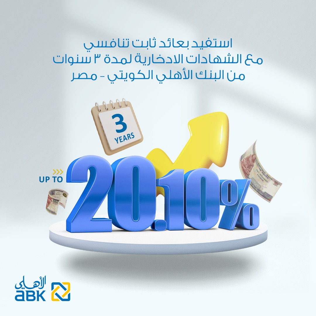 طرح البنك الأهلي الكويتي مصر شهادة ادخارية جديدة لمدة 3 سنوات بعائد صل إلى 20.10% ويمكنك اختيار دورية صرف العائد.