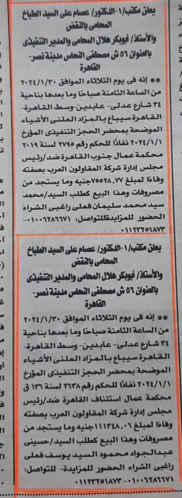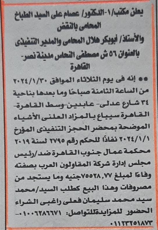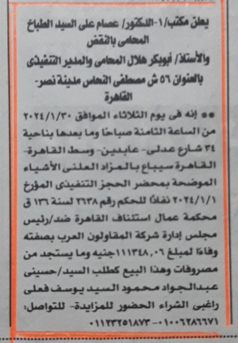 أعلن مكتب المحامي عصام الطباخ تحديد جلسة 30 يناير القادم ببيع بالمزاد العلني للأشياء الموضحة بمحضر الحجز التنفيذي المملوكة لشركة المقاولون العرب، تنفيذا للأحكام الصادرة ضدها بإلزامها بمبالغ مالية مستحقه للعمال نتيجة مطالبتهم بالمقابل النقدي لرصيد الاجازات الاعتيادية.
