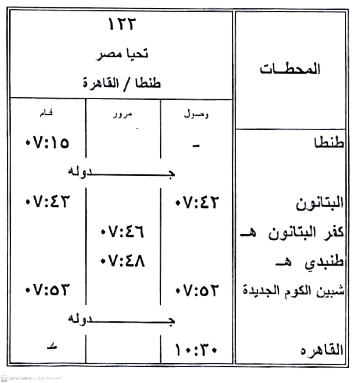 ثانيا: اعتبارا من يوم الإثنين الموافق 29 يناير 2024، يتم وقوف قطار 122 تحيا مصر طنطا / القاهرة بمحطة البتانون طبقًا للجدول المرفق.