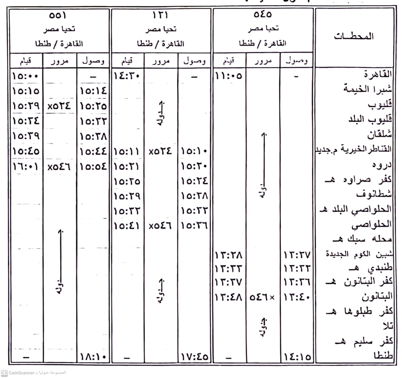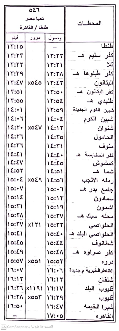 أولًا: اعتبارا من اليوم الخميس 25 يناير 2023، يتم تأخير ميعاد قطار 546 ركاب طنطا / منوف / القاهرة، لمدة 25 دقيقة، ليقوم الساعة 01:15 ظهرًا بدلًا من الساعة 12:50 ظهرًا ويترتب عليه تعديل مواعيد القطارات أرقام (545 – 121 – 551) تحيا مصر القاهرة / طنطا طبقًا للجداول المرفقة.