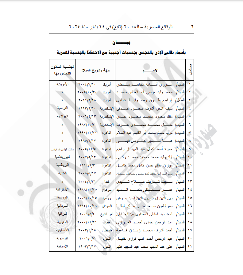 وجاء في القرار أنه بعد الاطلاع على الدستور، يؤذن لكل من الـ 21 مواطنا أولهم مروان أسامة مجاهد سلطان - وآخرهم السيد علي عبد المجيد محمد عبد المجيد غنيم، المدرجة أسماؤهم بالبيان المرفق بالتجنس بالجنسية الأجنبية الموضحة قرين اسم كل منهم، مع احتفاظهم بالجنسية المصرية.