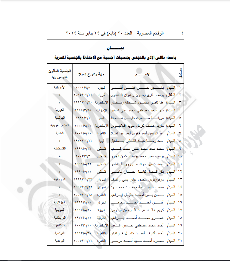 كما نشرت الجريدة قرار وزارة الداخلية حمل رقم 105 لسنة 2024 بأن يؤذن لكل من الواحد والعشرين مواطنا أولهم ياسين حسن علي، وآخرهم السيد حمزة أحمد سيد أحمد مرسي المدرجة أسماؤهم بالبيان المرفق بالتجنس بالجنسية الأجنبية الموضحة قرين اسم كل منهم، مع احتفاظهم بالجنسية المصرية.