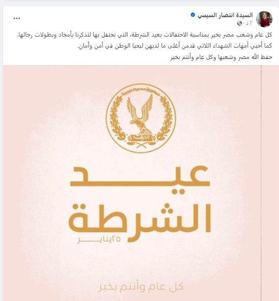 وقالت السيدة انتصار السيسي، في منشور لها، عبر صفحتها الرسمية على موقع التواصل الاجتماعي فيسبوك: كل عام وشعب مصر بخير بمناسبة الاحتفالات بعيد الشرطة، التي نحتفل بها لتذكرنا بأمجاد وبطولات رجالها، مضيفة: كما أحيي أمهات الشهداء اللاتي قدمن أغلى ما لديهن ليحيا الوطن في أمن وأمان.