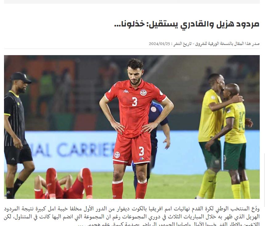 عنونت صحيفة الشروق عبر نسختها الألكترونية، حيث قالت: مردود هزيل والقادري يستقيل.. خذلونا، مشيرة إلى أن المنتخب التونسي قدم أداءًا هزيلًا، وودع منافسات كأس الأمم الإفريقية من الدور الأول، مخلفًا خيبة آمال كبيرة بعد ظهوره الباهت في المباريات الثلاث.
