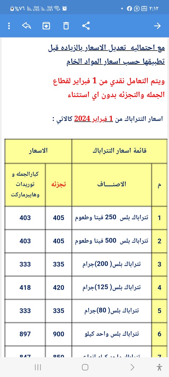 وحسب مستند رسمي حصل القاهرة 24 على نسخة منه، زاد سعر تتراباك بلس دومتي 250 جرام فيتا وطعوم، من 375 جنيها إلى مستوى 403 جنيهات جملة، و405 جنيهات تجزئة.