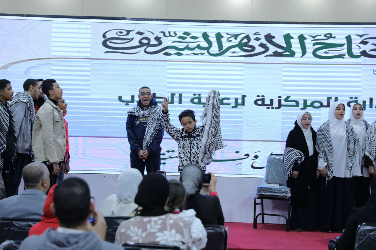 وكخطوة إنسانية بعث جناح الأزهر في أول أيام معرض القاهرة الدولي للكتاب في نسخته ال 55، رسالة واضحة للعالم؛ مفادها أن القضية الفلسطينية هي قضية عادلة، وأن الشعب الفلسطيني يستحق أن يعيش في وطنه حرا أبيا، وتم التعبير عن هذا التضامن من خلال عرض مسرحي قام به طلاب منطقة أسيوط الأزهرية، جسدوا من خلاله المعاناة التي يعيشها الشعب الفلسطيني، وجرائم الاحتلال الإسرائيلي المتواصلة ضده، حيث بدأ العرض المسرحي بمجموعة من المشاهد تجسد معاناة الشعب الفلسطيني، من تهجير قسري، وقتل وتشريد، وتدمير للبيوت والمرافق، وفي نهاية العرض المسرحي، وجه الطلاب رسالة للعالم، أعربوا فيها عن أملهم في أن يروا الفرحة على وجوه أطفال فلسطين، وأن القضية الفلسطينية هي قضية الأجيال، وأنها مسؤوليتهم الحفاظ عليها.