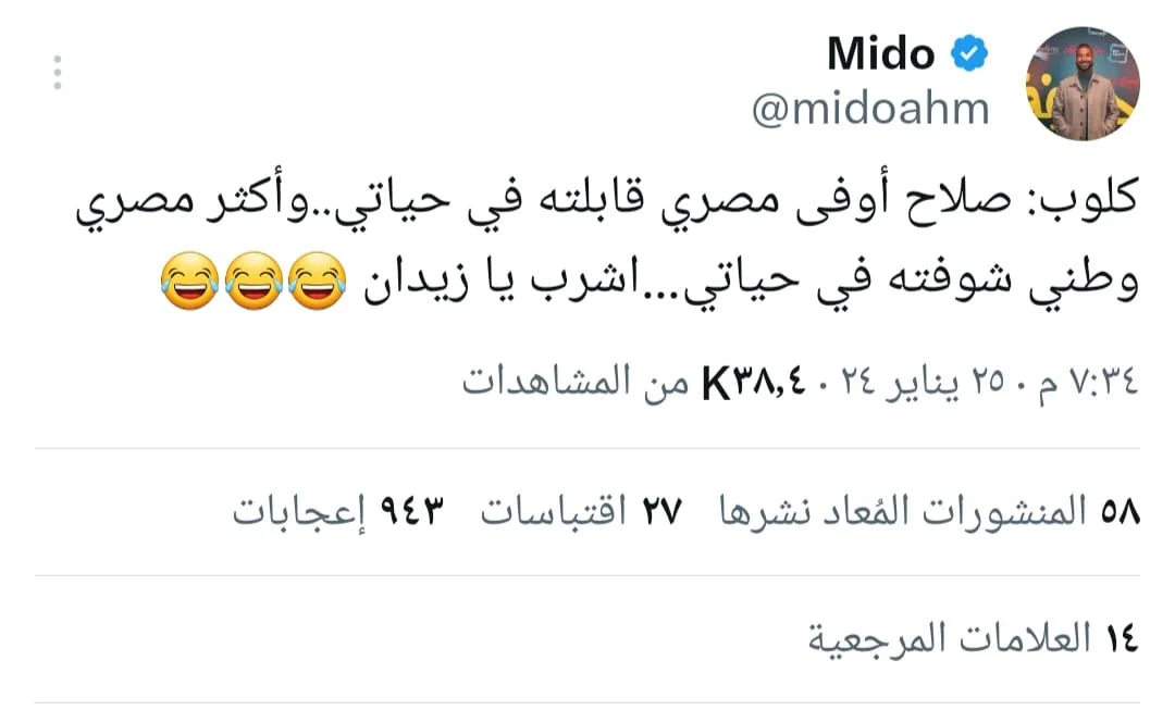 وكتب ميدو على تصريحاته عبر موقع التواصل الاجتماعي تويتر: صلاح أكثر أوفى مصري قابلته في حياتي.. وأكثر مصري شوفته في حياتي.. أشرب يا زيدان.