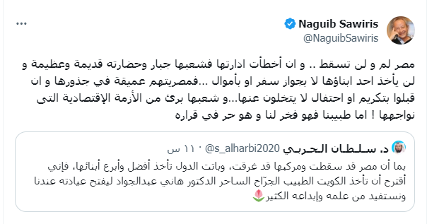 وعن اقتراح المُغرد أخذ الكويت الطبيب الجرّاح الساحر الدكتور هاني عبد الجواد ليفتح عيادته في الكويت، علق ساويرس: أما طبيبنا فهو فخر لنا، وهو حر في قراره.