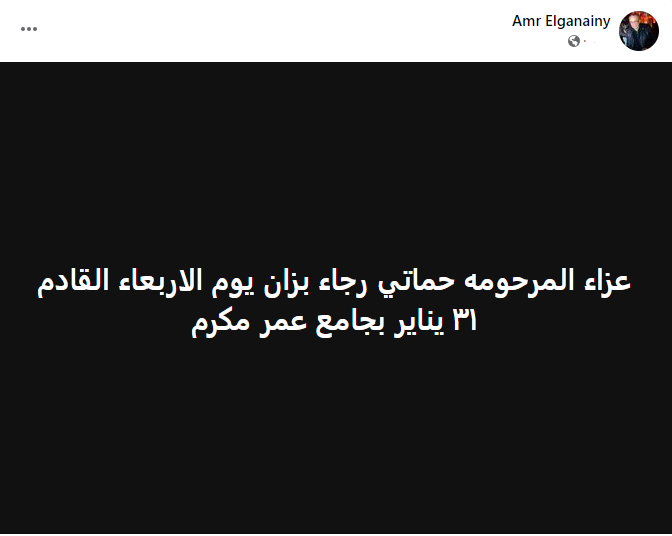 وكان عمرو الجنايني كتب منشورا عبر صفحته الرسمية على موقع التواصل الاجتماعي فيسبوك قائلا: البقاء لله.. توفت إلى رحمه الله حماتي المرحومة بإذن الله رجاء أحمد بزان.. الجنازة بعد صلاة الظهر بمسجد السيدة نفيسة.. نرجوكم الدعاء.