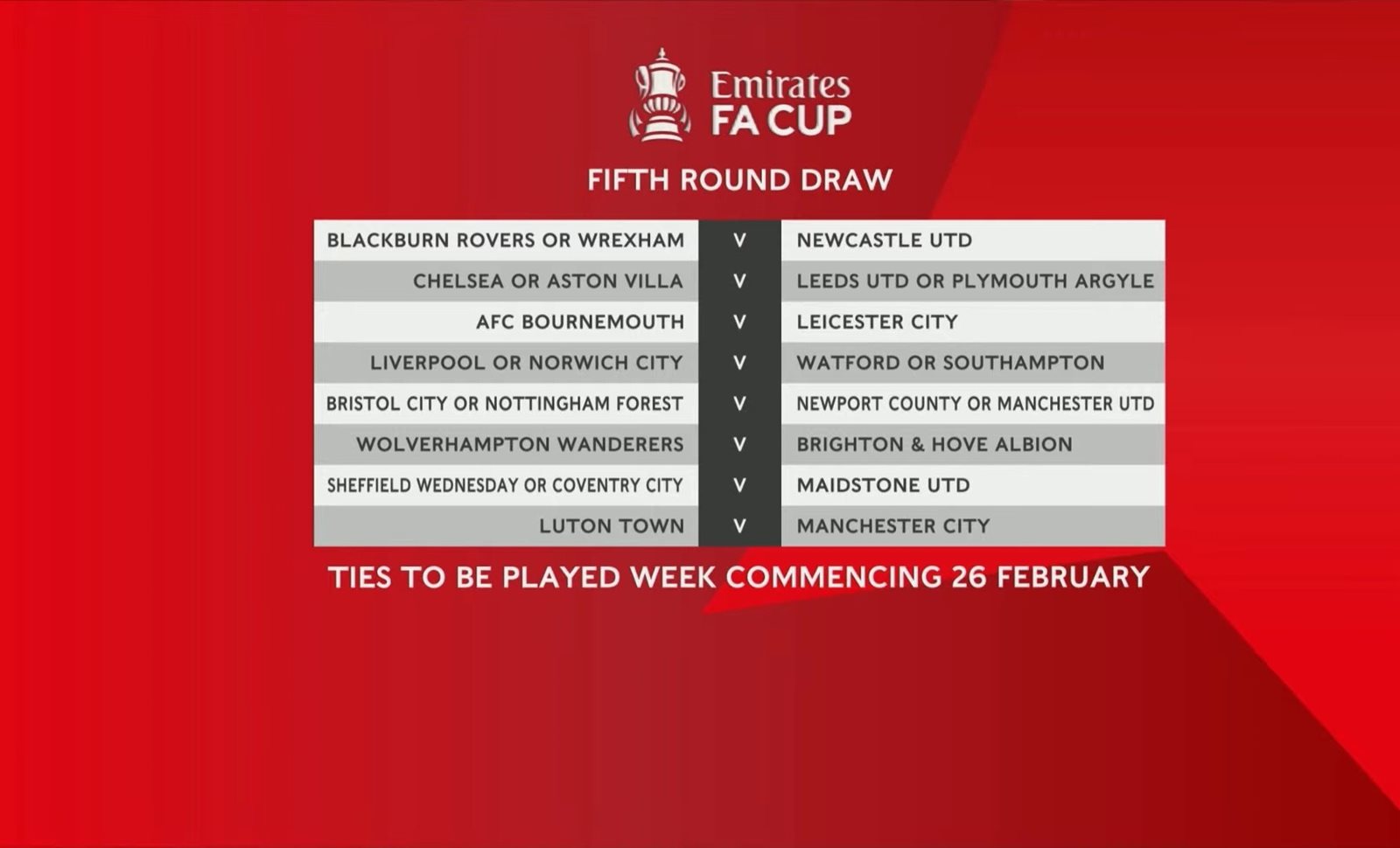 يذكر أنه تأجلت قرعة دور الـ 16 في بطولة كأس الاتحاد الإنجليزي، بسبب أحداث الشغب التي حدثت في مباراة وست بروميتش ألبيون ضد وولفرهامبتون التي أقيمت قبل قليل.