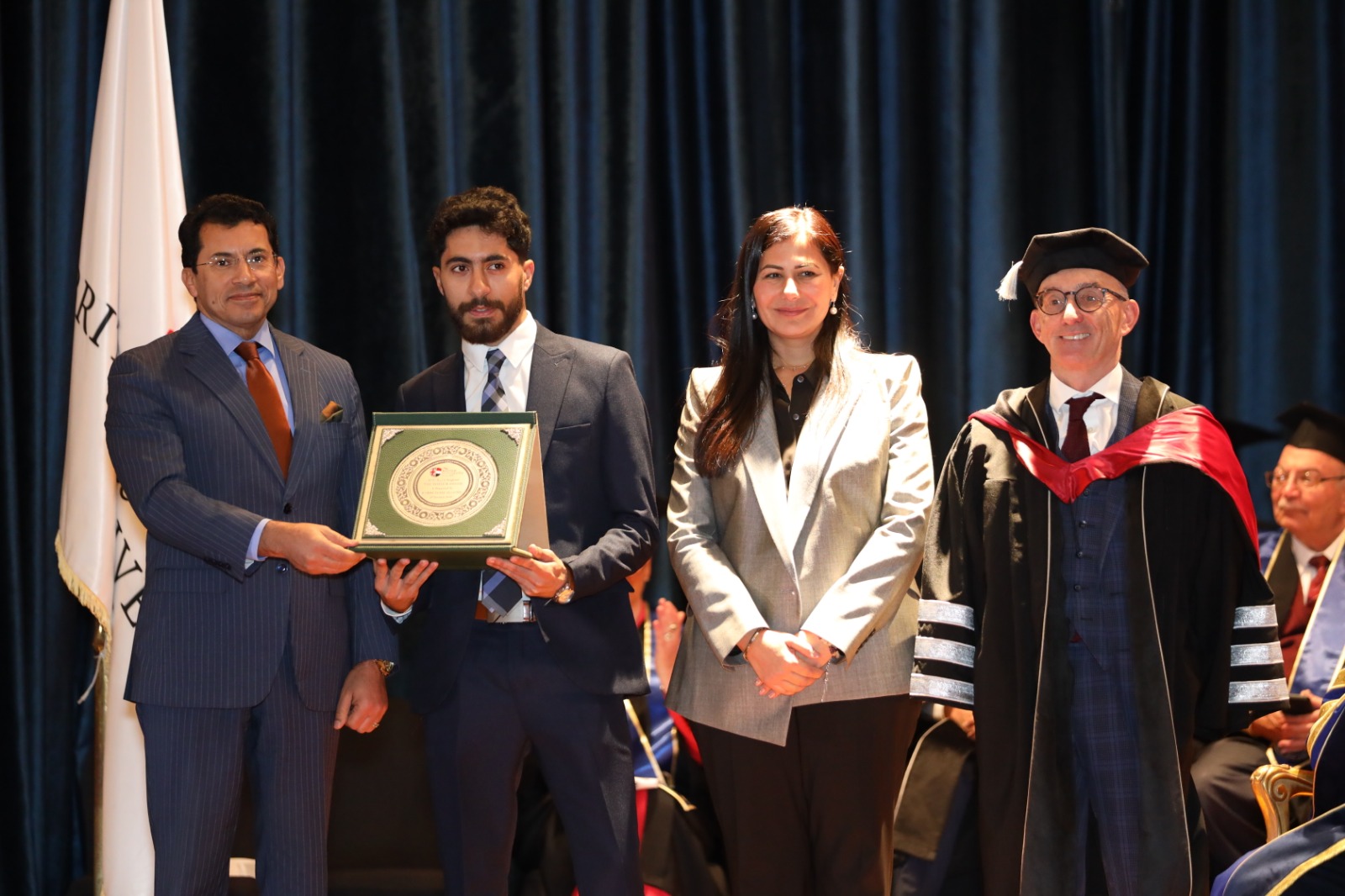 من جهته، سلم الدكتور أشرف صبحي، وزير الشباب والرياضة، درع التميز ( BUE Best and Brightest)، لثلاثة من طلاب الجامعة المتميزين، وهم كريم طارق السيد جودة خريج كلية طب وجراحة الفم والأسنان بالجامعة لقيادة القوافل الطبية المعاونة لطلاب تحيا مصر لمدة عامين متتالين كما ترأس أسرة متطوعي الجامعة لجمع التبرعات لصالح أهالي فلسطين، والطالبة جومانا أحمد مجاهد، خريجة قسم العلوم السياسية بكلية الاقتصاد والعلوم السياسية وإدارة الأعمال بالجامعة لإسهاماتها المتميزة في مؤتمر قمة المناخ COP28، والطالبة فريدة هاني إبراهيم، خريجة قسم الاقتصاد بكلية الاقتصاد والعلوم السياسية وإدارة الأعمال، لترأسها وتمثيلها طلاب نموذجى محاكاة قمة المناخ COP 27 / COP 28.