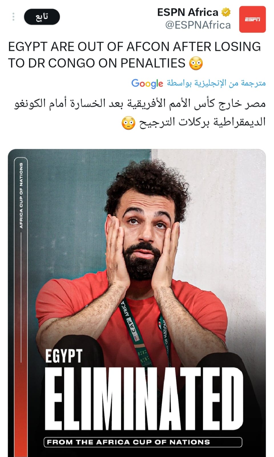 قالت صحيفة ESpin العالمية في عنوانها عبر حسابها الرسمي على موقع التواصل الاجتماعي تويتر، مصر تخرج من بطولة كأس الأمم الإفريقية كوت ديفوار 2023 على أمام منتخب الكونغو الديمقراطية بشكل مفاجئ وغير متوقع وبدون نجم ليفربول محمد صلاح.