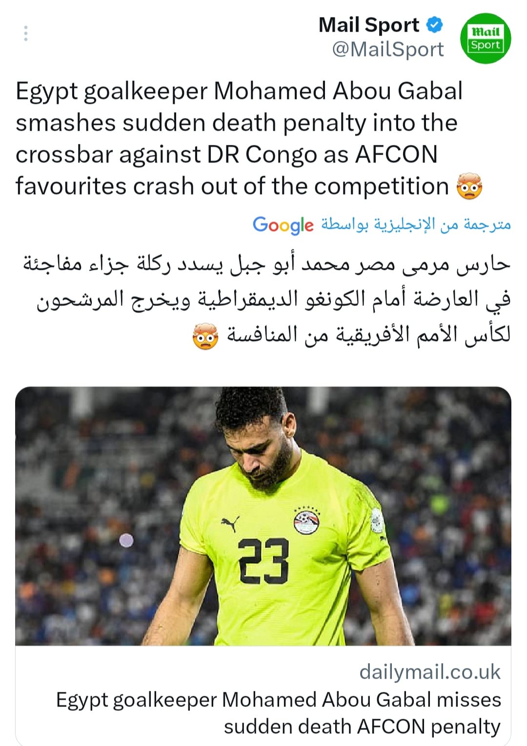 بينما قالت صحيفة ميل سبورت البريطانية، إن حارس مصر محمد أبو جبل يسدد ركلة جزاء مفاجئة في العارضة أمام منتخب الكونغو الديمقراطية ليخرج منتخب الفراعنة من دور ثمن نهائي البطولة القارية رغم أنهم كانوا المرشحين للفوز بلقب كأس الأمم الإفريقية كوت ديفوار 2023.