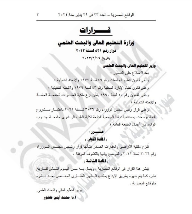 الجريدة الرسمية تنشر قرار التعليم العالي بشأن نزع ملكية أراضٍ وعقارات لتوسعات مستشفى قنا الجامعي