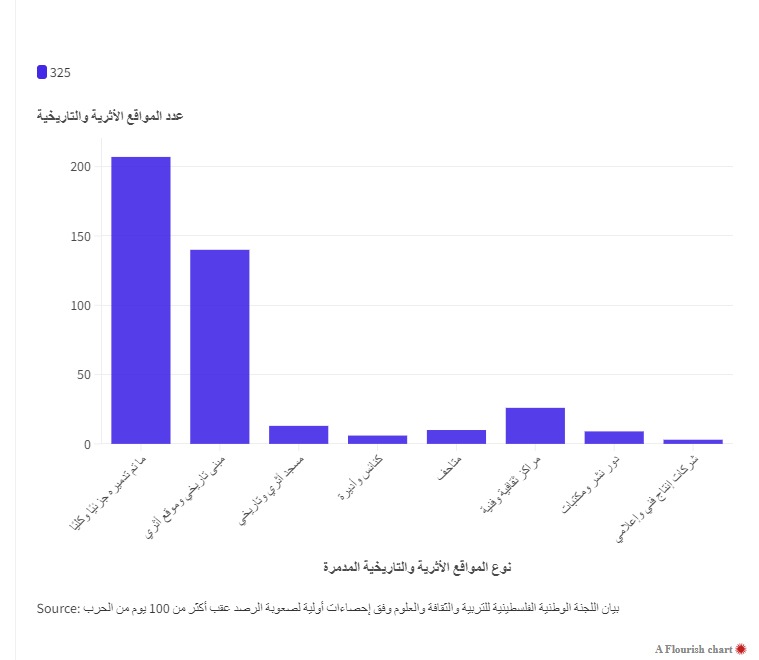 يقول فادي أبو بكر مدير عام الإدارة العامة للدوائر التخصصية في اللجنة الوطنية الفلسطينية للتربية والثقافة والعلوم، بأن المواقع الأثرية والتراثية في قطاع غزة يبلغ عددها أكثر من 360 موقعا، موضحا أن مجموع ما تم رصده من تدمير طالته تلك المباني يبلغ حوالي 207 موقعا، من بينها المسجد العمري وكنيسة بيرفيريوس التاريخية والتي تعد من أقدم الكنائس عالميا.