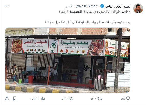 ويقول نصر الدين عامر رئيس مجلس إدارة وكالة الأنباء اليمنية سبأ ونائب رئيس الهيئة الإعلامية لأنصار الله الحوثيين عبر حسابه في إكس: مطعم طوفان الأقصى في مدينة الحديدة اليمنية.. يجب ترسيخ ملاحم الجهاد والبطولة في كل تفاصيل حياتنا.