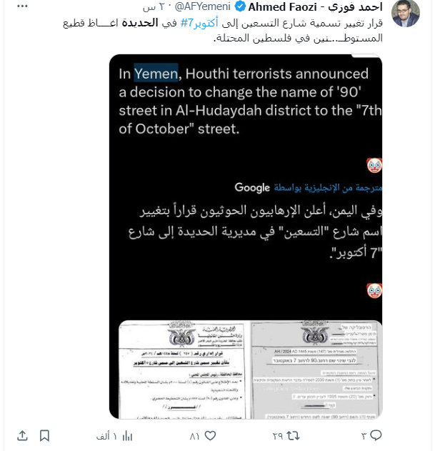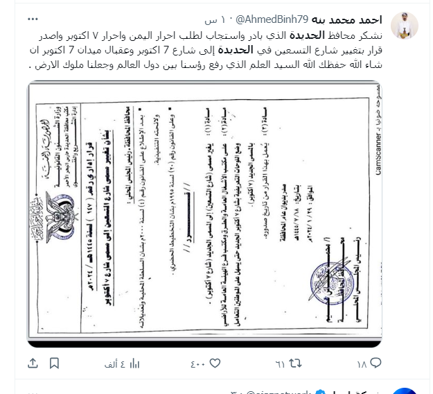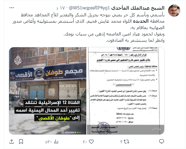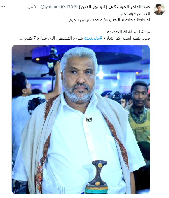 أيضا يغرد المواطن اليمني عبد القادر الموشكي (ابو نور الدين) قائلًا: الف تحية وسلام لمحافظ محافظة الحديدة/ محمد عياش قحيم.. يقوم بتغير اسم اكبر شارع بالحديدة شارع التسعين الى شارع 7 أكتوبر.