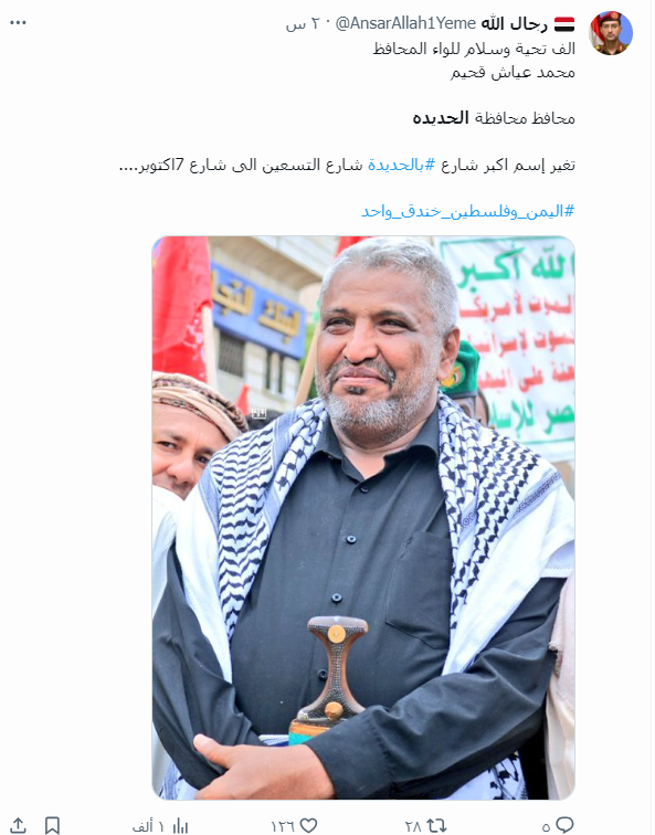 أما الحساب الذي يحمل اسم رجال الله فيقول: الف تحية وسلام للواء المحافظ محمد عياش قحيم محافظ محافظة الحديدة.. تغير اسم أكبر شارع بالحديدة شارع التسعين إلى شارع 7 أكتوبر.