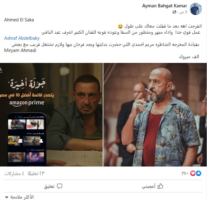 وكتب أيمن بهجت قمر عبر حسابه الرسمي بموقع فيسبوك: أتفرجت أهو بعد ما قفلت معاك على طول يا سقا، عمل قوي جدا وأداء مبهر ومتطور من السقا، وعودة قوية للفنان الكبير أشرف عبد الباقي، بقيادة المخرجة الشاطرة مريم أحمدي، اللي حضرت بدايتها وبجد فرحان بيها ولازم نشتغل قريب مع بعض، ألف مبروك.
