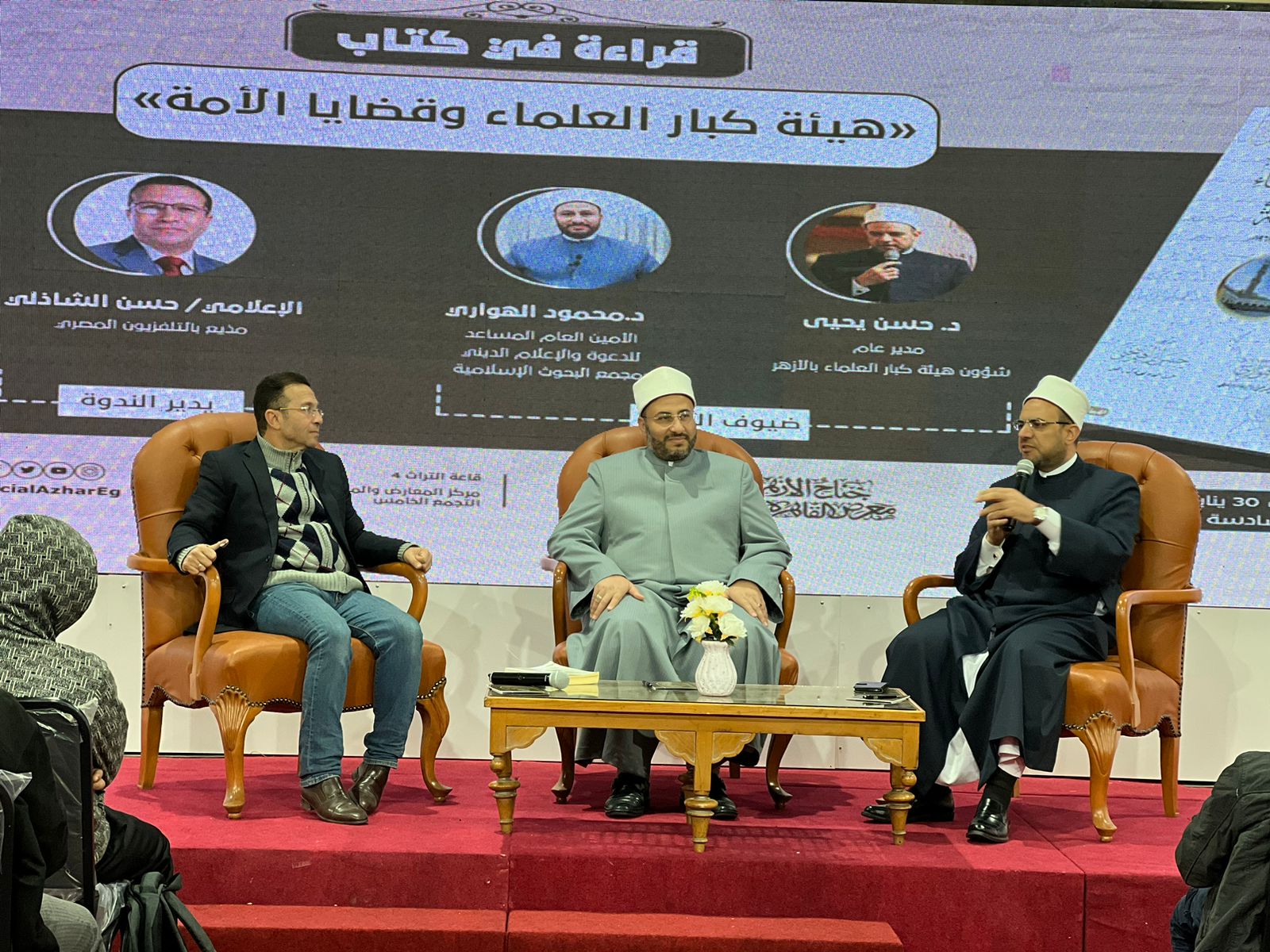 واصل جناح الأزهر الشريف بمعرض القاهرة الدولي للكتاب، اليوم الثلاثاء، سلسلة ندواته التثقيفية التي يعقدها في إطار حملة "إقرأ"، حيث ناقشت ندوة اليوم كتاب "هيئة كبار العلماء وقضايا الأمة"، بمشاركة الدكتور محمود الهواري، الأمين العام المساعد للدعوة والإعلام الديني بمجمع البحوث الإسلامية، الدكتور حسن يحيى، مدير عام شؤون هيئة كبار العلماء بالأزهر، ويدير الندوة الإعلامي حسن الشاذلي، المذيع بالتليفزيون المصري.