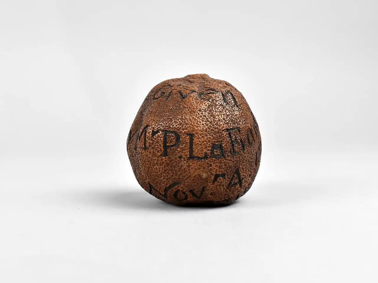 عثر على ثمار الحمضيات البنية المجففة مقاس 2 بوصة في خزانة خلال عملية تطهير المنزل، حيث كان البائعون يفرزون ممتلكات عمهم واعتقدوا أنه صندوقًا يعود تاريخه إلى القرن التاسع عشر، وقد يكون ذا قيمة، لذا أخذوه إلى أحد بائعي المزاد.
