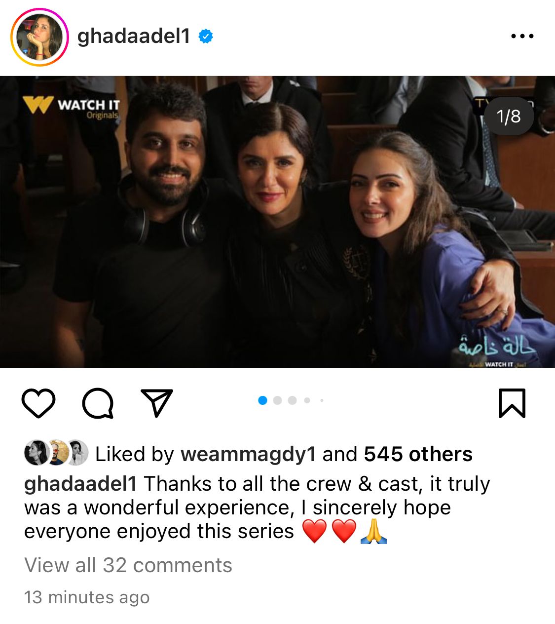 ونشرت غادة عادل عبر حسابها الرسمي، بموقع تبادل الصور والفيديوهات انستجرام صورًا لها، رفقة فريق العمل وعلقت عليها قائلة: شكرًا لجميع طاقم العمل، والممثلين، لقد كانت تجربة رائعة حقًا، وآمل بصدق أن يستمتع الجميع بهذه السلسلة.