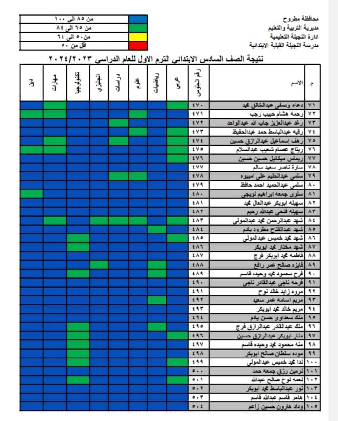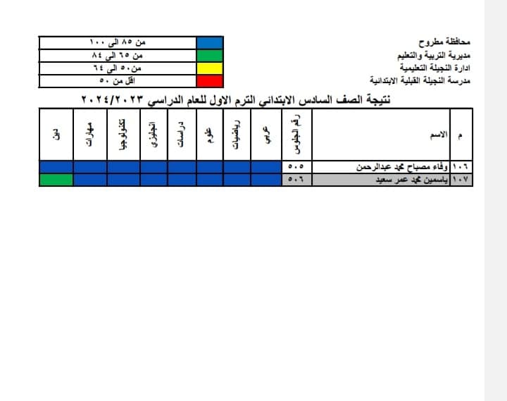 وجاءت نتيجة الصف السادس الابتدائي برقم الجلوس والاسم 2024 كالاتي: