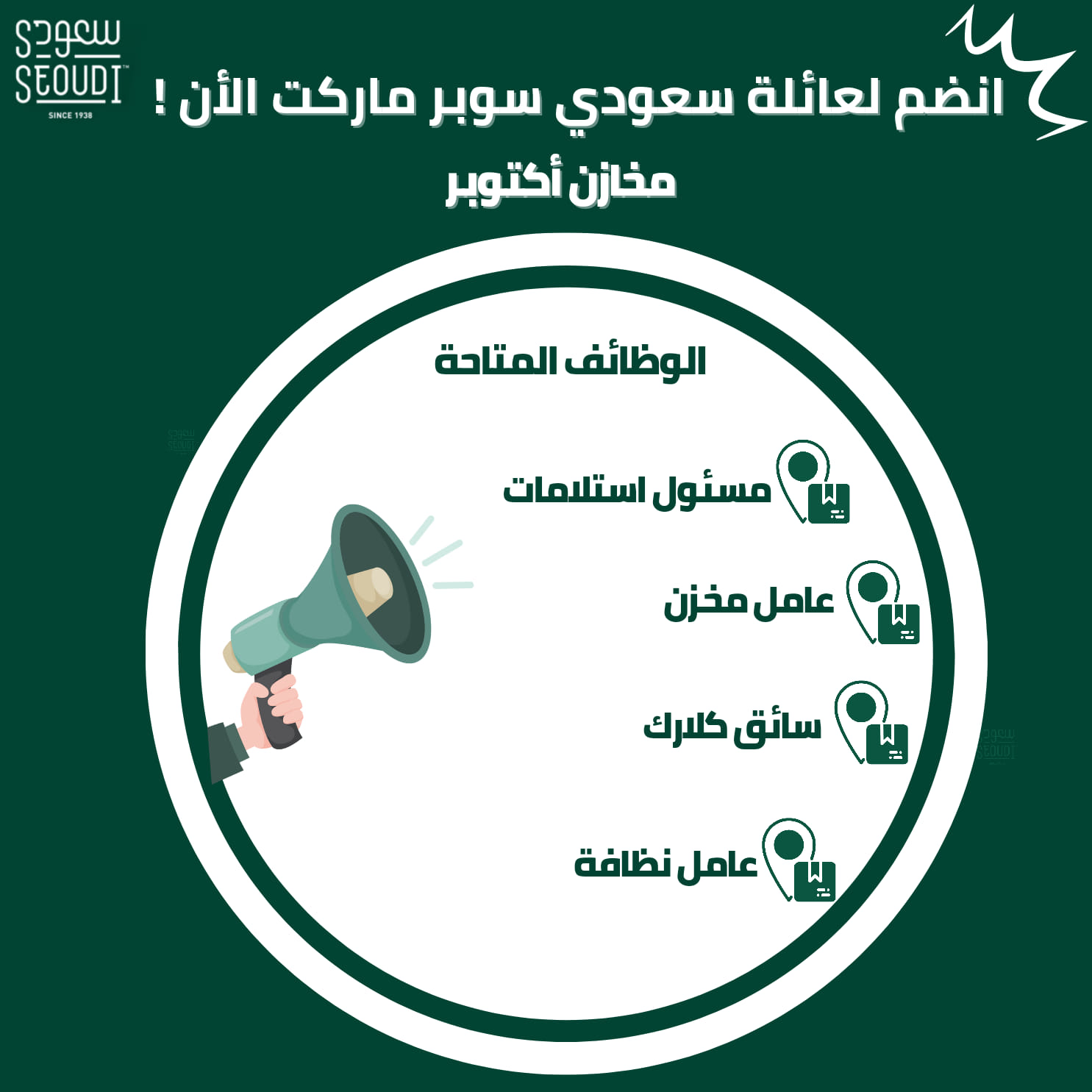 أعلنت مجموعة سلاسل سعودي سوبر ماركت عن حاجتها لشغل وظائف في مقر مخازن أكتوبر، مع إتاحة وسيلة مواصلات من وإلى المخزن ووجبة غداء، وتأمين طبي واجتماعي وحوافز ومنح ومكافأت سنوية وفرص للترقية، مع عدم إتاحة التعيين للمغتربين حاليًا.