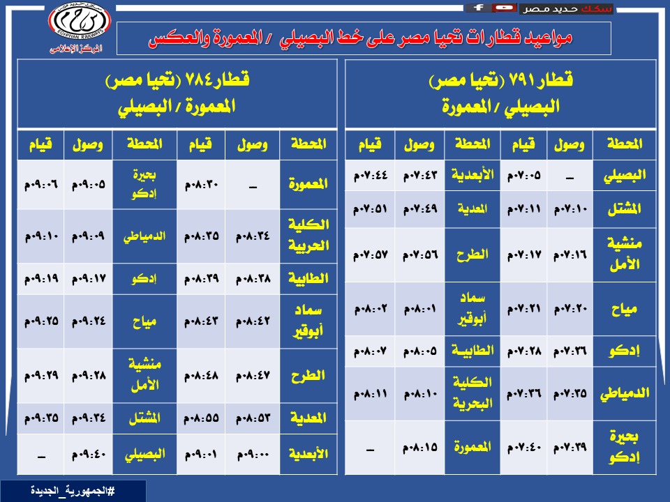 كما سيتم تشغيل خدمة جديدة بخط المعمورة / البصيلي وهما قطاري 790 / 791 طبقًا للجداول المرفقة ويترتب على ذلك تعديل ميعاد قطار 767 ركاب رشيد / المعمورة.