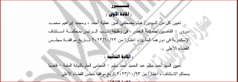 كما نشرت الجريدة أيضًا قرارً بتعيين أحمد سليم عبد الحميد أحمد سليم، المحامي العام بالنيابة العامة، قاضيا بمحاكم الاستئناف، اعتبارا من 23/ 10/ 2023.