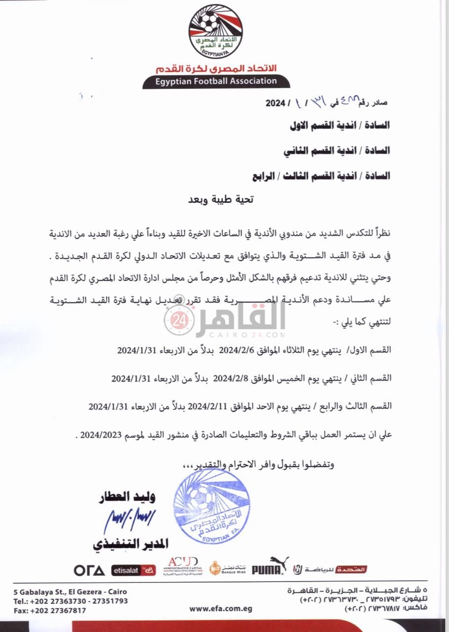 ووفقًا لخطاب أرسله اتحاد الكرة إلى الأندية في وقت مبكر من صباح اليوم من المقرر أن يتم إغلاق باب القيد الشتوي لأندية بالنسبة لأندية القسم الثاني يوم 8 فبراير، وبالنسبة لأندية القسمين الثالث والرابع من المقرر أن ينتهي القيد الشتوي يوم 11 فبراير.