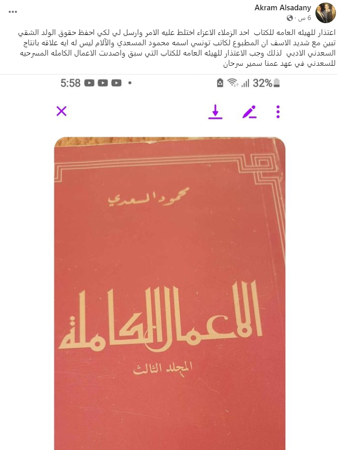 وكتب أكرم السعدني عبر حسابه على فيسبوك، الآتي: اعتذار للهيئة العامة للكتاب.. أحد الزملاء الأعزاء اختلط عليه الأمر وأرسل لي لكي أحفظ حقوق الولد الشقي.. تبين مع شديد الأسف أن المطبوع لكاتب تونسي اسمه محمود المسعدي والآلام ليس له أية علاقة بإنتاج السعدني الأدبي.. لذلك وجب الاعتذار للهيئة العامة للكتاب التي سبق وأصدرت الأعمال الكاملة المسرحية للسعدني في عهد عمنا سمير سرحان.