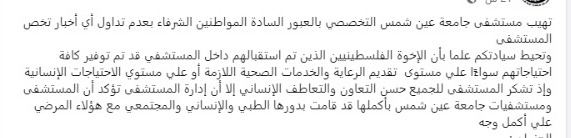 مستشفى عين شمس التخصصي يعلق على أنباء طلب المساعدات للإخوة الفلسطينيين