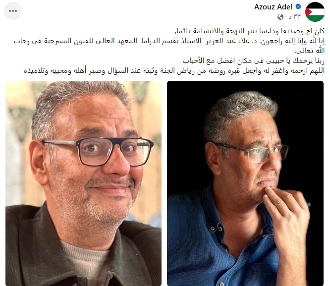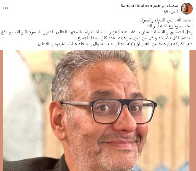 الحمد لله.. في السراء والضراء القلب موجوع لكنه أمر الله رحل الصديق والاستاذ الفنان د علاء عبد العزيز، أستاذ الدراما بالمعهد العالي للفنون المسرحية والأب والأخ الداعم لكل تلاميذه وكل من أمن بموهبته فقد كان سندا للجميع دعواتكم له بالرحمة من الله وأن يثبته الخالق عند السؤال ويدخله جنات الفردوس الأعلى.