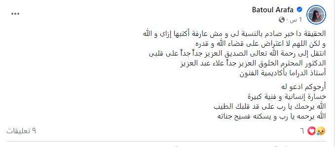 كما حرصت المخرجة بتول عرفة أيضًا على تقديم النعي للراحل علاء عبد العزيز وكتبت عبر حسابها على موقع التواصل فيسبوك وعلقت قائلة: الحقيقة دا خبر صادم بالنسبة لى ومش عارفة أكتبها إزاى والله ولكن اللهم لا اعتراض على قضاء الله وقدره انتقل إلى رحمة الله تعالى الصديق العزيز جدًا جدًا على قلبى الدكتور المحترم الخلوق العزيز جدًاعلاء عبد العزيز أستاذ الدراما بأكاديمية الفنون أرجوكم ادعو له خسارة إنسانية وفنية كبيرة الله يرحمك يا رب على قد قلبك الطيب الله يرحمه يا رب ويسكنه فسيح جنات.