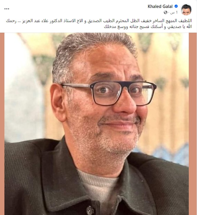كما حرص المخرج خالد جلال على تقديم النعي للراحل ونشر عبر حسابه بموقع التواصل الاجتماعي فيسبوك قائلًا: اللطيف المبهج الساخر خفيف الظل المحترم الطيب الصديق والأخ الأستاذ الدكتور علاء عبد العزيز.. رحمك الله يا صديقي وأسكنك فسيح جناته ووسع مدخلك.