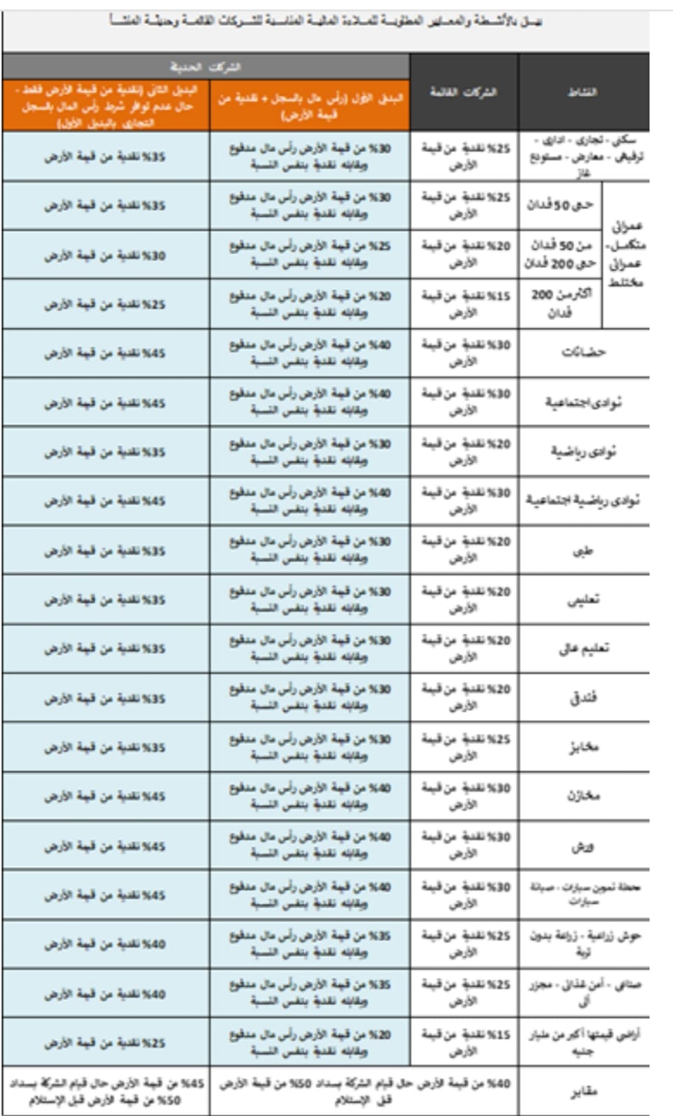 ويخص الشركات العاملة في النشاطات المختلفة سواء كان سكني أو تجاري او إداري أو ترفيهي أو معارض أو مستوع غاز، في حال كانت الشركة القائمة 25% من إجمالي قيمة الأرض، أما في حالة الشركات الحديثة تكون 30% من قيمة الأرض مدفوع ويقابله نقدية بنفس النسبة.