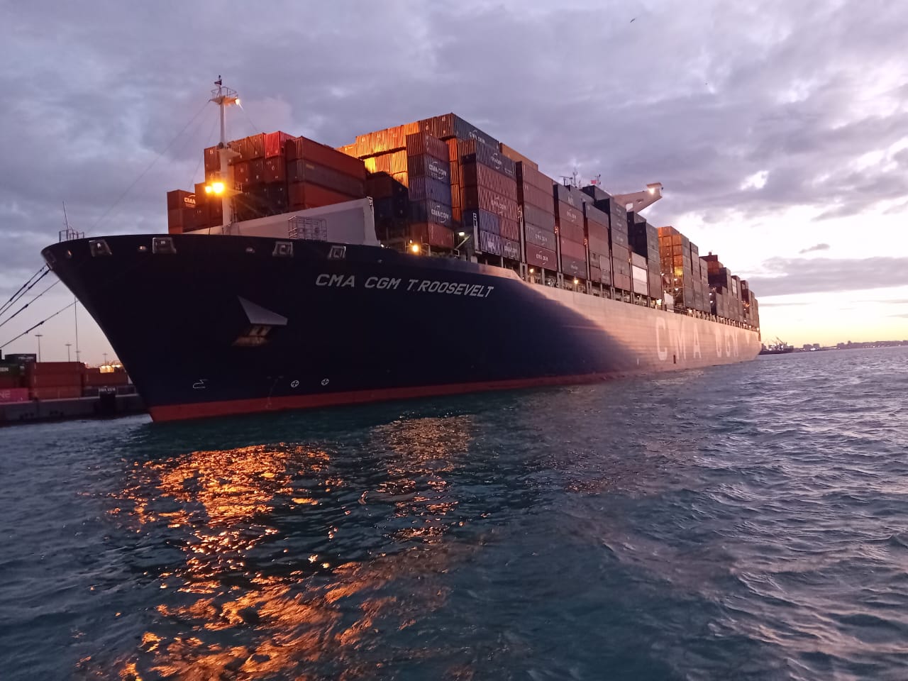 ويصل طول السفينة T.ROOSEVELT والتي ترفع العلم المالطي إلى 365.9 م بعرض 48.2 م وبغاطس يصل إلى نحو 16م بحمولة كلية 142 ألف طن بطاقة 14،440 حاوية مكافئة وجاري حاليا العمل على تفريغ حمولتها.