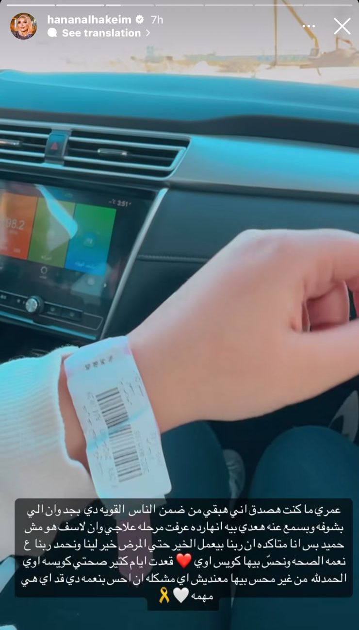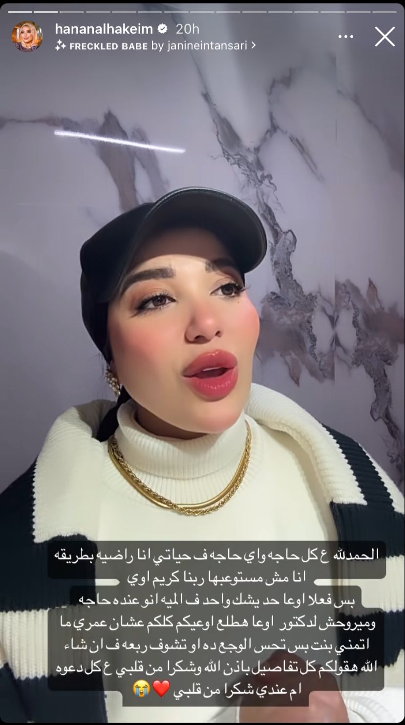 وكتبت البلوجر حنان الحكيم، عبر خاصية ستوري بحسابها الرسمي على إنستجرام، عمري ما كنت هصدق إني هبقى من الناس القوية دي بجد وإن اللي بشوفه وبسمع عنه هعدي بيه.. انهاردة عرفت مرحلة علاجي وإن للأسف الورم مش حميد، بس أنا متأكدة إن ربنا بيعمل الخير.. حتى المرض خير لينا ونحمد ربنا على نعمة الصحة ونحس بها كويس أوي.